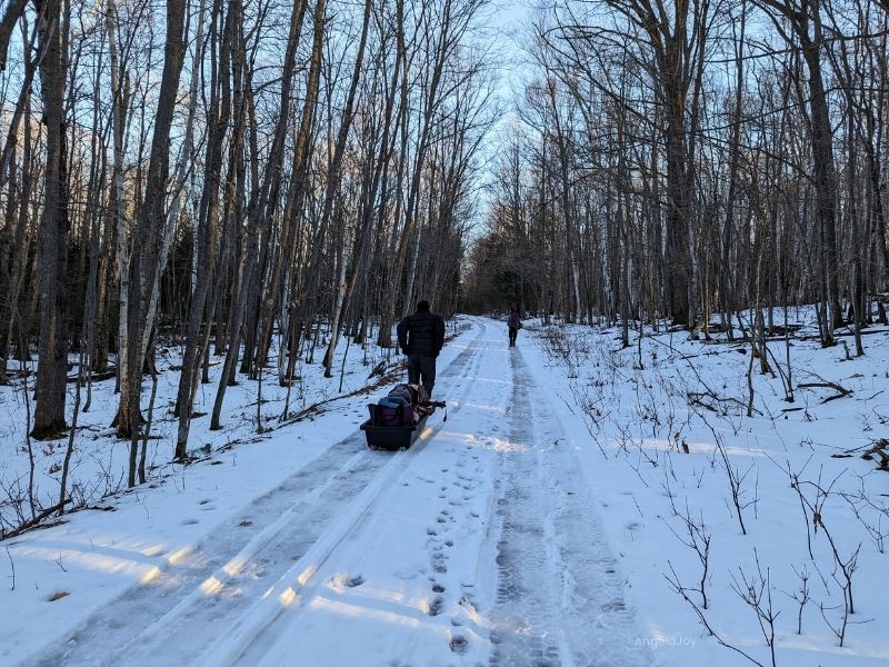Just half a mile from the parking area, the Little Presque Isle cabin offers the perfect escape into nature. The short hike is manageable in any season; however, in late winter, we were thrilled to find the trail still blanketed in snow which was ideal for pulling a sled stacked with water, food, and heavier supplies.